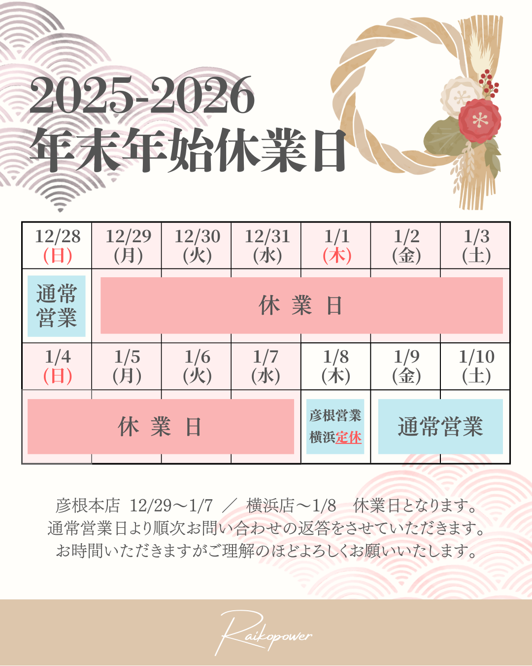 いつもRAIKO彦根本店・横浜店をご利用いただきありがとうございます。 誠に勝手ながら下記日程を年末年始休業日とさせて頂きます。 彦根本店 12月29日(金)~1月4日(木) 横浜店 12月29日(金)~1月5日(金) […]