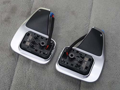 通常、パドルシフトを後付けするにはパドル対応ステアリングへの交換が必要ですが、今回はMスポーツのステアリングを加工することでパドルシフトを取り付けています。