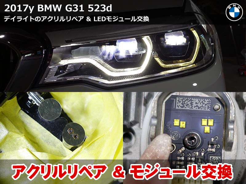 BMW F10 ヘッドライト異常を修理。TMSはBMW純正新品へ交換済みなのでコンピューター初期化とLED学習で警告解除し正常点灯を復活させました。