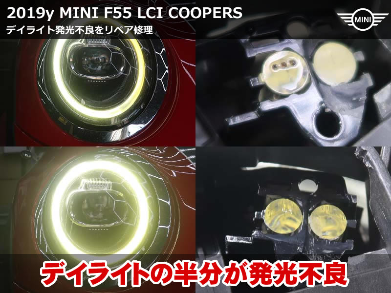 F55 クーパーS デイライト修理|半分だけ茶色に発光する症状をアクリルリペアで解決新着!!
